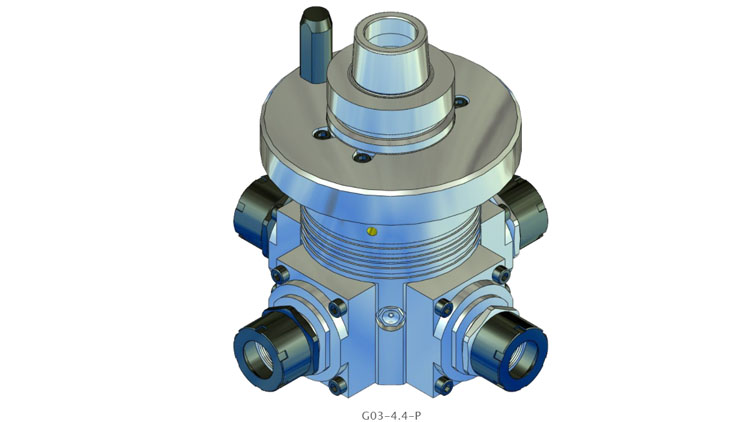 G03 系列的角头具有多达四个加工主轴。所有刀架的主轴旋转方向始终与驱动器的旋转方向相同。驱动速度以 1:1.55 的比例传递到刀架。间歇运行时主轴最高转速可达 18,000 rpm。