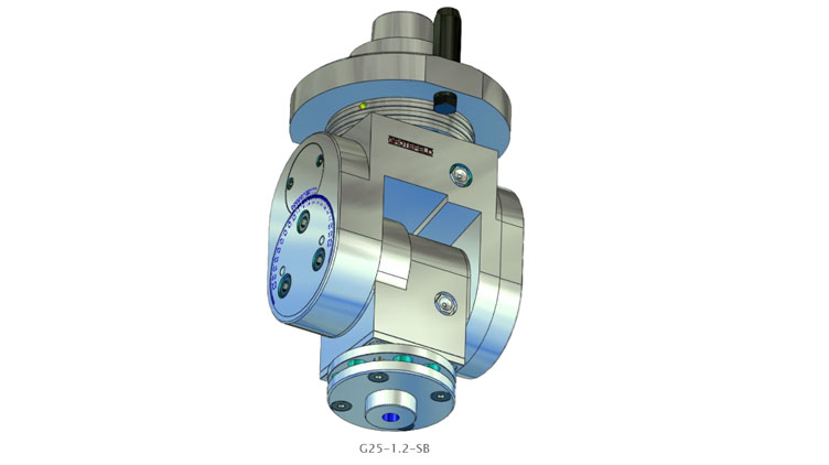 G25系列的角头具有可根据刻度进行无级调整的加工主轴。设置范围从 0°(垂直)扩展到两侧最大 100°。主轴的旋转方向与驱动器的旋转方向相反。